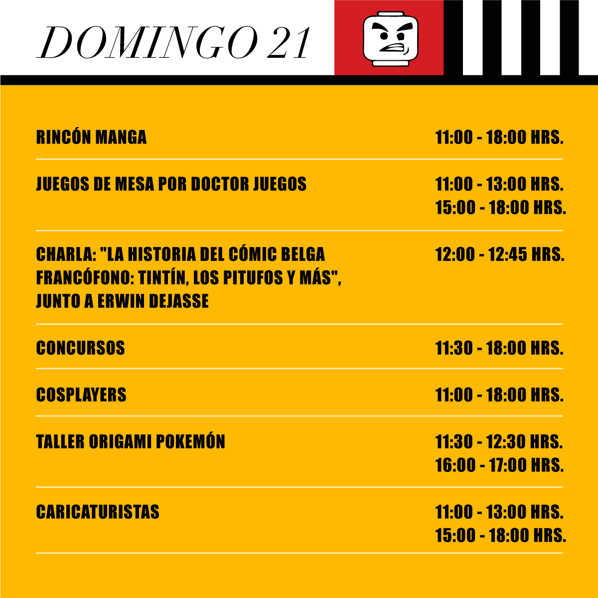 El domigno 21, una de las grandes actividades que se van a realizar es una charla a cargo de la Representación Valonia – Bruselas parte de la Embajada de Bélgica en Chile. Consiste en un conversatorio que lleva como consigna “Historia del cómic belga francófono: Tintín, Los Pitufos y más”.